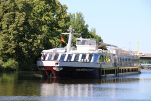 Schliesslich legten wir vor der Schleuse kurz vor Oldenburg an einem für Flusskreuzfahrtschiffe reservierten Platz an. Derjenige für Sportboote war durch ein Arbeitsschiff besetzt. Wir machten uns etwas Sorge, weil unterhalb der Schleuse beginnt wieder Gezeitengewässer und es herrschte gerade Ebbe. Dann sahen wir, dass sich ein Twerenbold-Schiff, die Excelsior Pearl, der Schleuse näherte und bergwärts schleuste. Wenn die das kann, besteht für uns kein Grund zur Sorge, zumal die Flut wieder eingesetzt hatte.