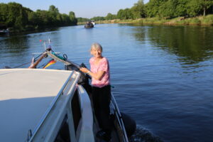 Um 7:56 Uhr verliessen wir den Anlegesteg, wendeten die Schiffe und fuhren hinaus in die Ems. Es war ruhig und auf dem Fluss gab es noch keinen Verkehr. Wir wussten, es würde eine lange Fahrt, planten wir doch 78.7 km zurückzulegen. Am Morgen geht noch alles ruhig von der Hand und deshalb putzte Brigitte noch unsere Deckaufbauten.