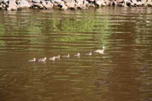 Die grosse Entenfamilie pflügte ebenfalls durchs Wasser. Es gibt wohl wenig natürliche Feinde, dass alle überlebten, oder die Mutter ist sehr erfahren, oder sowohl, als auch.