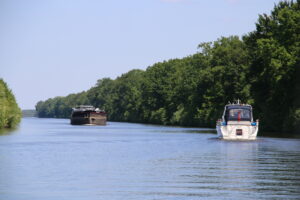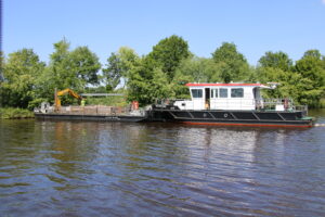 Der Küstenkanal wird gut unterhalten. Das sahen wir einerseits an den neuen Steinen, die über weite Strecken das Ufer schützen. Zudem konnten wir ein Arbeitsschiff beobachten, das gerade daran war, eine Uferböschung mit Steinen zu verstärken.