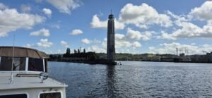 Oben angekommen, gleiten wir auf dem Albertkanal südwärts. Links und rechts säumen Industrieanlagen das Ufer – manche noch in Betrieb, andere längst vom Rost gezeichnet. Wir passieren eine bunte Armada alternativer Boote, festgemacht wie schwimmende Kunstwerke, Relikte aus einer anderen Zeit. Und gegenüber: Der einzige Leuchtturm im belgischen Binnenland, davor die Statue von König Albert I. – ein maritimer Gruss mitten im Landesinneren.