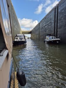 Schon nach flotten 4,5 Kilometern bergauf erreichten wir um 10:50 Uhr die Schleusenanlage von Lanaye mit ihren vier mächtigen Kammern. Andreas übernahm die Anmeldung mit souveräner Sprachgewandtheit auf Französisch. Just in dem Moment, als ein Frachter talwärts Kammer 3 (Länge 136 m, Breite 16 m, Fallhöhe 13,65 m) verliess, durften wir direkt einfahren – ohne Wartezeit, wie es sich gehört.