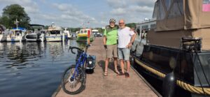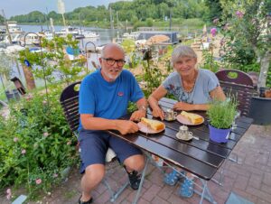 Nach einem kurzen Schwatz mit Weingärtners, die noch einkaufen und Mölln anschauen wollen, mussten wir wieder Abschied nehmen. Nach einer kurzen Erholung von den Strapazen seiner Fahrradtour von Thun nach Lübeck sowie der Erholungsfahrt mit der Taranaki nach Mölln wollte sich Roland wieder aufs Rad schwingen. Wir hätten ihn gerne noch weiterhin an Bord als Gast mirgenommen, aber ihr wisst ja: Reisende soll man nicht aufhalten! So gab es noch eine letzte gemeinsame Foto, bevor er auf staubigen Wegen und grobschlächtigen Strassen das Weite suchte. Auf das Tau, das wir ihm für alle Fälle mitgeben wollten, verzichtete er ausdrücklich.