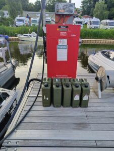 Ich wollte ebenfalls tanken und erwähnte, dass ich sehr langsam tanken würde, wegen der unzulänglichen Entlüftung. Sie sagte, das gehe nicht, sie könne nur auf dem kleinsten Klick tanken. Aber wir könnten 20 Liter-Kanister abfüllen und diese dann in unsere Tanks einfüllen. Sie habe erst kürzlich wegen eines dänischen Katamarans die Ölwehr aufbieten müssen, das wolle sie nicht nochmal erleben.