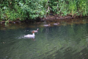 Unterwegs beobachtete ich eine Sägerfamilie mit Jungen. Roland meinte, er habe bisher nur Stockenten gesehen, aber es gibt auch andere.