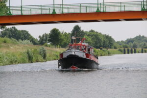 Vor der Schleuse Lauenburg kam uns das einzige grössere Schiff entgegen. Einen fahrenden Frachter hatten wir auf der ganzen Strecke zwischen Lübeck und Lauenburg keinen einzigen gesehen.