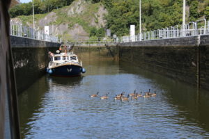 Am nächsten Morgen fuhren wir etwas später, als geplant, los Richtung Dinant. Bereits einige hundert Meter nach dem Start gab es die erste Schleuse. Wir bekamen Zuwachs durch ein Paar aus den Niederlanden, die mit uns alle sechs Schleusen bergwärts fuhren.