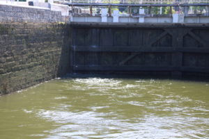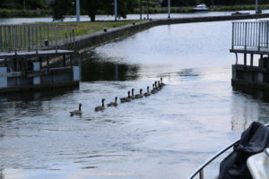 Diese Weisswangengänse sind eingefahren, als die Tore noch gar nicht ganz geöffnet waren. Dann sind sie neben unserem Schiff nach hinten geschwommen, weil sie wussten: Vorne werden die einsprudelnden Wasser zu unerwünschten Strömungen bis Wildwasser führen. Als der Sturm vorüber war, mochten sie wiederum nicht warten, bis sich die Tore ganz geöffnet hatten.