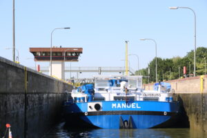 Der Frachter fuhr zu Tal und wir warteten auf die nächste Gelegenheit. Nun erschien hinter uns der Tanker Manuel. Der Schleusenwärter bat den Tanker, nach vorne zu fahren, damit das Sportboot auch noch mitgenommen werden kann. Wir waren sehr froh, dass wir nicht noch länger in der Bruthitze ausharren mussten.