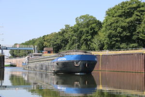Bereits ein paar Kilometer weiter zeigte uns die Waterkaart App, dass wir die Schleuse Duisburg-Meiderich als Verbindung zum Rhein wählen sollten. Ich funkte die Schleuse an und sah erst jetzt, dass diese Schleuse über längere Zeit nicht in Betrieb sein wird, Wir wechselten daher zur Ruhrschleuse Duisburg. Diese wird normalerweise nur von grossen Frachtern befahren.