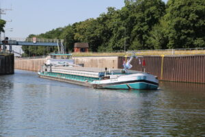 Wir verliessen deshalb Oberhausen um halb neun Uhr und fuhren just vor dem Frachter Te Fiti den Rhein-Herne-Kanal Richtung Schleuse Oberhausen.