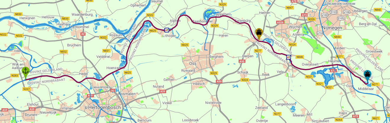 Schliesslich legen wir am Gästesteg der Haven Watersportvereniging in Heusden an und melden uns beim Hafenmeister. Der Hafen ist gut besetzt, aber es gibt noch zwei freie Plätze. Nach einigem Suchen findet Robert die Anlegestelle. Es ist sehr, sehr eng und ich bin als Anfänger etwas überfordert. Mit Hilfe der im Hafen liegenden Skipper und meinem Bruder gelingt schliesslich das Anlegemanöver. Erschwerend kommt hinzu, dass das Bugstrahlruder aus noch unerklärlichen Gründen keine Kraft entwickelt. Ich muss deshalb ohne manöverieren, was mich zwingt, ohne auszukomme. Das hat den Vorteil, dass ich besser fahren lerne.