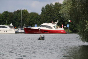Spätestens vor der Schleuse Grave begann es zu tröpfeln und als sich die Schleusentore öffneten, schüttete es in Strömen. Dazu blies ein starker Wind in die Schleusenkammer und stellte die Taranaki kurz schräg. In dieser Situation muss das Ruderblatt optimal angeströmt werden und das geht nur mit entsprechend Gas geben. Ich wollte ja nicht die kleineren Sportboote nicht zerquetschen (es waren Joghurt-Becher-Boote).