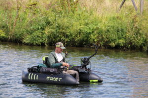 Vor der Gaja sitzt ein Mann im Wasser. Das Ganze sieht wie ein Fauteuil aus, mit dem Unterschied, dass der Besitzer wasserdichte Hosen und Schwimmflossen anhat.