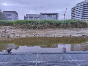Gegenüber dem Jachthaven gibt es einen Kanal, in dem das Wasser die Gezeiten mitmacht. Er wird nicht geregelt und startet neben der Duffel-Schleuse. Das Ende ist zugemauert und trotzdem gibt es dort beachtliche Wirbel. Das rührt vom Kanalwasser der Nete, das bei Ebbe durch den Damm den Weg bis in den Kanal findet.