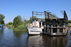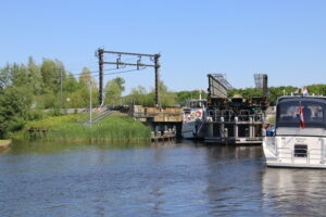 Erstaunlich: Immer wenn wir uns Brücken näherten, schalteten die Brückenwärter auf rot – grün, was bedeutet, dass die Brückenöffnung vorbereitet wird. Es wurde uns langsam unheimlich. Peter Morgenthaler fuhr mit der Zattera voraus und er behauptete, das Schiff und er seien eben im Friesland weitherum bekannt und deshalb gingen die Brücken automatisch auf.