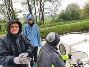 An- und Ablegen an allen Arten von Stegen, um so nicht nur unsere Kapitänskenntnisse zu stärken, sondern uns auch als Matrosen zu schulen. Und um der Schulung noch das Tüpfchen auf dem i zu verleihen, sind wir mehrmals schön verregnet worden. So ist auch die Regenausrüstung schon am ersten Tag auf dem Wasser eingeweiht worden.