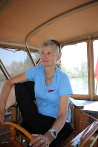 Auch Brigitte fuhr heute mehrmals eine Strecke. Sie machte ihre Sache gut, insbesondere dann, als ich den Masten ablegte und uns starke Wellen verursachende Motorboote entgegen fuhren. Schön eingedreht sind die Wellen kein Problem.