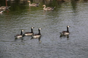 Unterwegs konnten wir wiederum Tiere beobachten. Dabei gelang mir ein Schnappschuss zu einer Gänseart, die ich bis dahin noch nicht bestimmen konnte: Die Weisswangengans. Diese Gänseart ist ein Koloniebrüter auf Felsinseln in der Tundra, neuerdings aushc in der Ostsee. Überwintert an Nordwesteuropas Küsten. Diese Gänse soweit im Süden zu entdecken, war für mich eine kleine Überraschung.