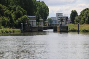 In der App Gewässerkarte waren die Schleusen Roermond und Linne mit einer Warnung versehen: Die Wartezeit auf eine Schleusung betrage maximal 2 Stunden. Wir machten uns auf etwas gefasst. Als ich die Schleuse Roermond anfunkte, bekam ich vom Schleusenwart die Antwort, er leere die Schleuse und dann könnten wir bergwärts schleusen. Die Ampel wechselte auf Rot-Grün und ich wartete die Einfahrt dümpelnd ab.