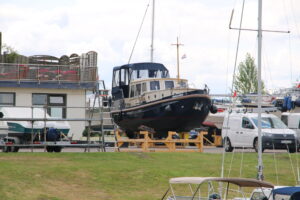 Wir passierten Roermond und erreichten bald den Schiffsbroker Schepenkring Krekelberg Nautic, der für den Verkauf der Highlander von Robert verantwortlich zeichnete. Zu unserer grossen Überraschung steht die Highlander prominent auf dem Areal der Werft. Wird er bereits wieder verkauft?
