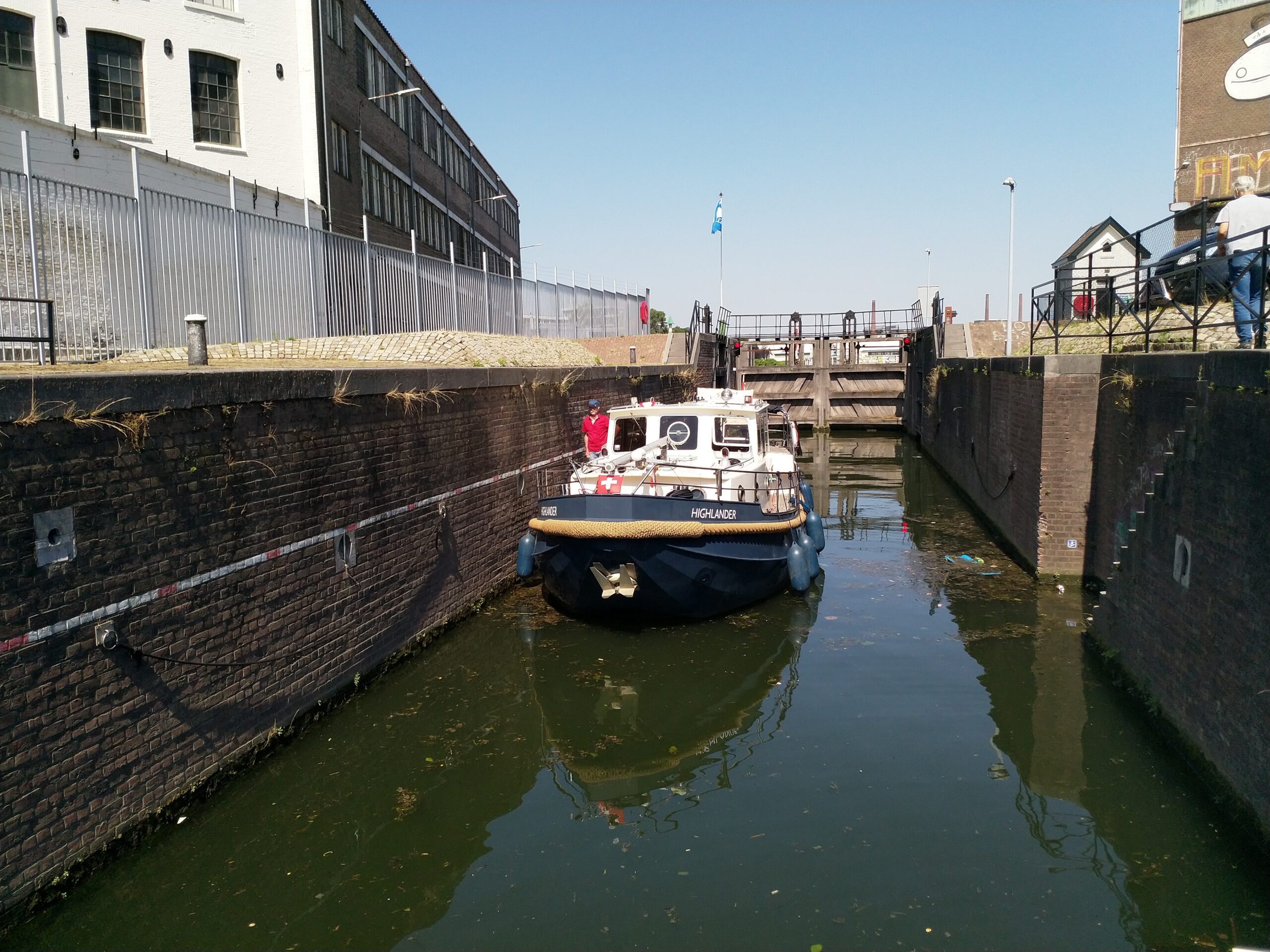 Die Highlander, festgemacht in der Maasbracht-Schleuse.