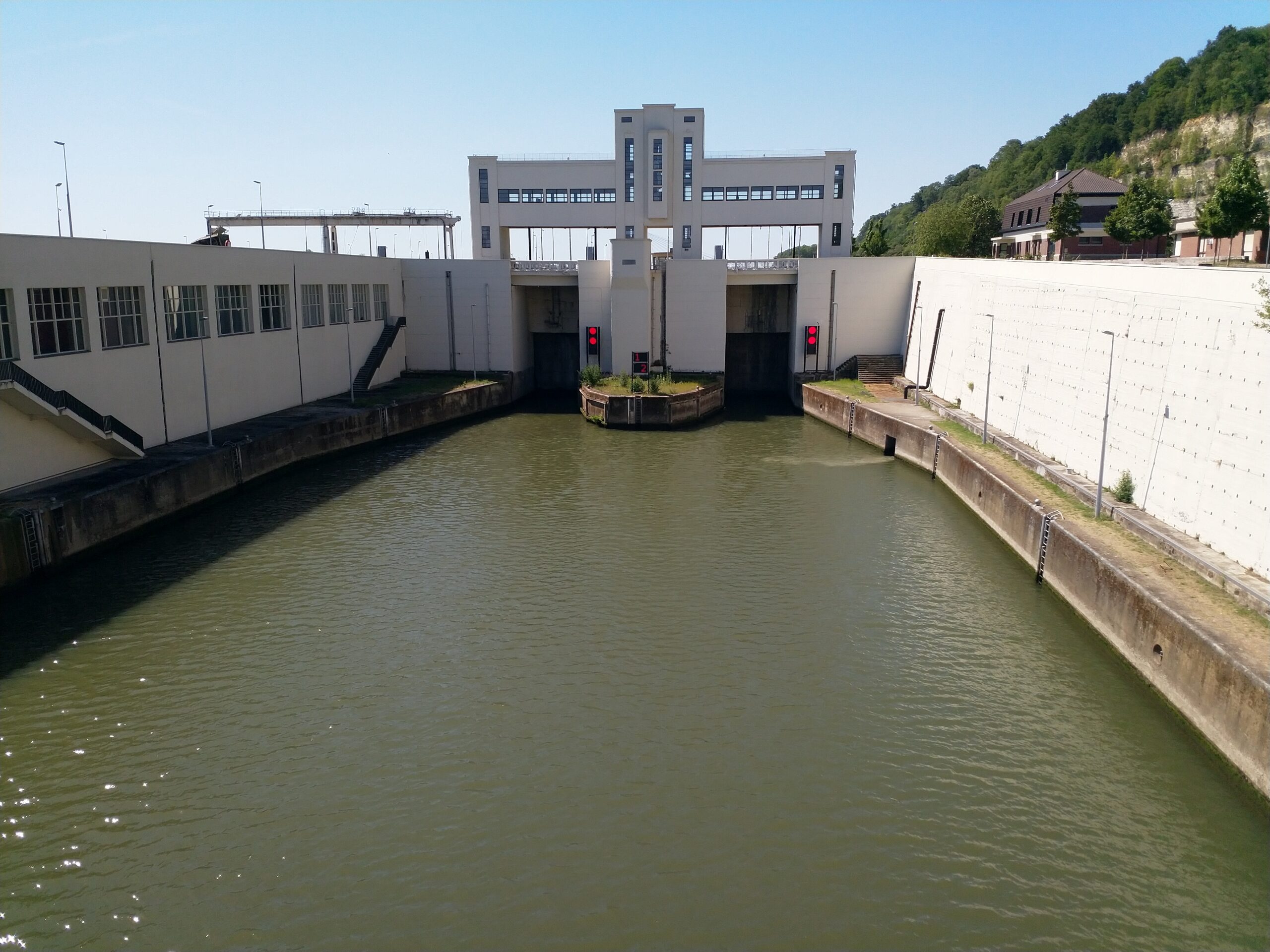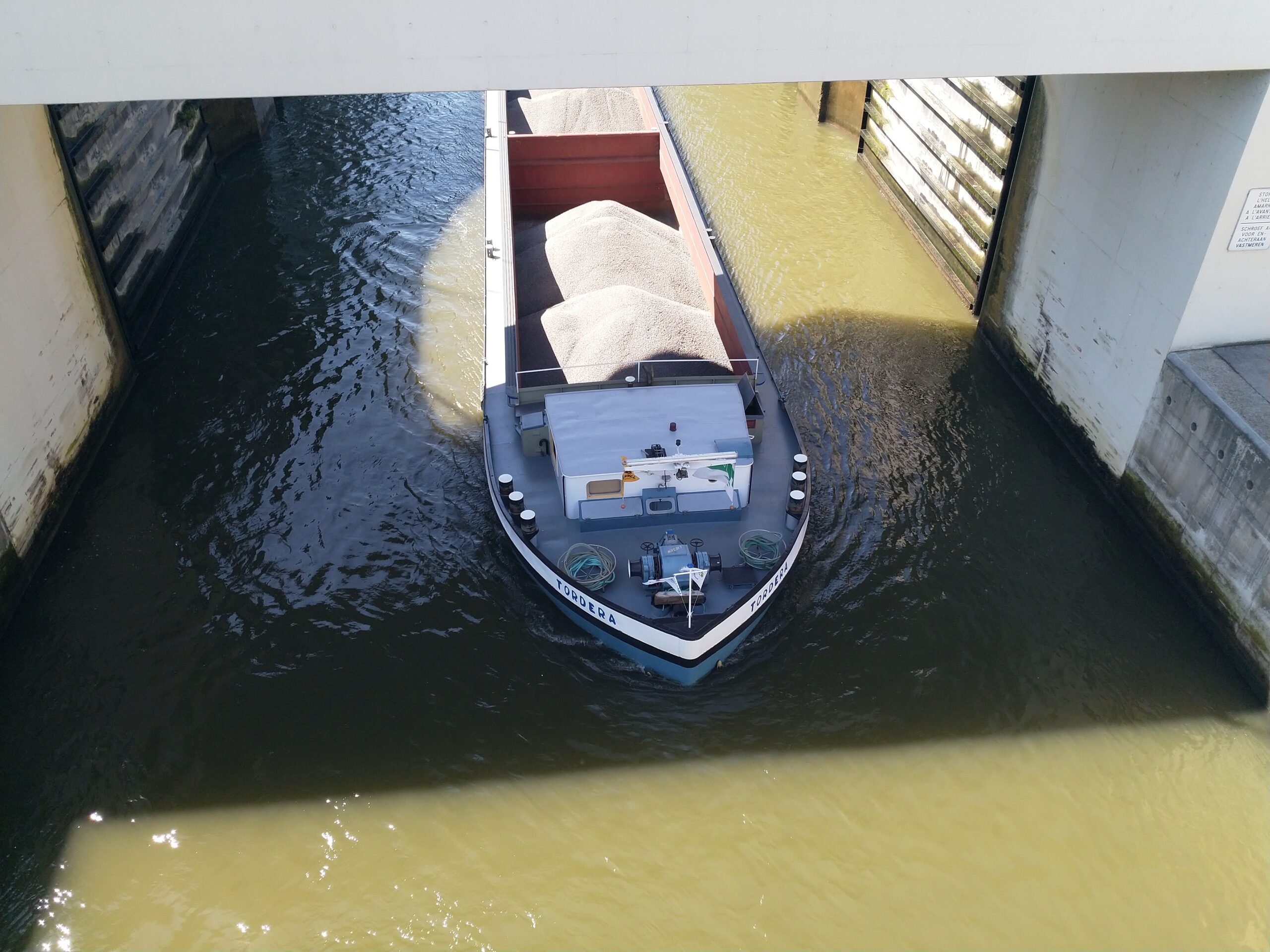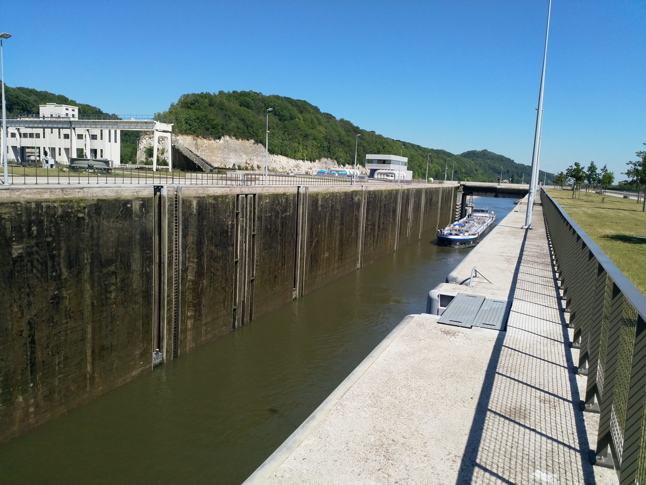 Am letzten Tag unseres Törns wollte uns Robert die Schleusen von Lanaye zeigen. Das sind echt mächtige Dinger, wobei die Berufsschiffer nach der Schleusenausfahrt ihre Cargos um rund 330 ° in den Koning-Albert-Kanaal umwerfen. Eindrücklich, wie folgende Bilder zeigen.