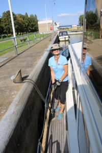 Dann ging’s Richtung Linne-Schleuse. Adrian und Ilse konnten zum ersten Mal miterleben, was Schleusen heisst und welche Aufgaben der Fender-Mieze und dem Skipper zukommen.