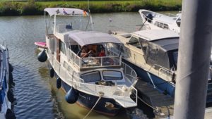Natürlich musste ich die angelegten Schiffe betrachten, wobei ich ein besonderes familienfreundliches entdeckte, das auf dem Vordach mit einer Art Laufgitter ausgestattet war. Der Vater in der Mitte, das Kleinkind rechts und die Tochter links: Sehr schöne Art, mit einer Familie auszufahren.