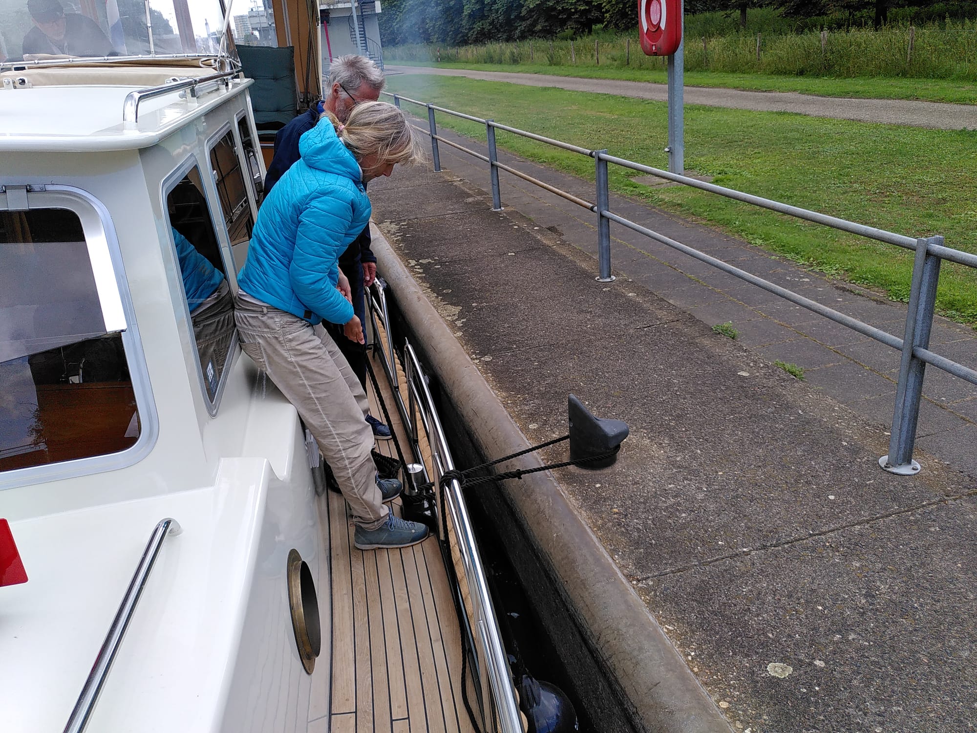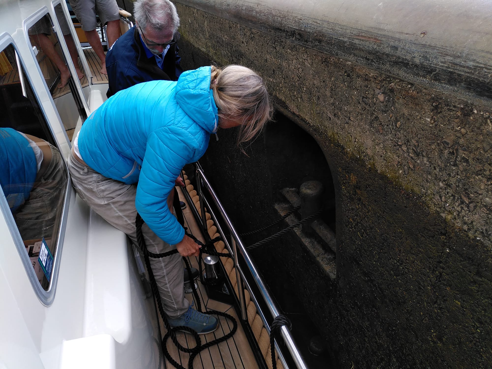 Bei der ersten Schleuse musste Brigitte bereits die Taue umlegen, schwieriger als Schwimmpoller. Es klappte sehr gut, wie die Foto zeigt.
