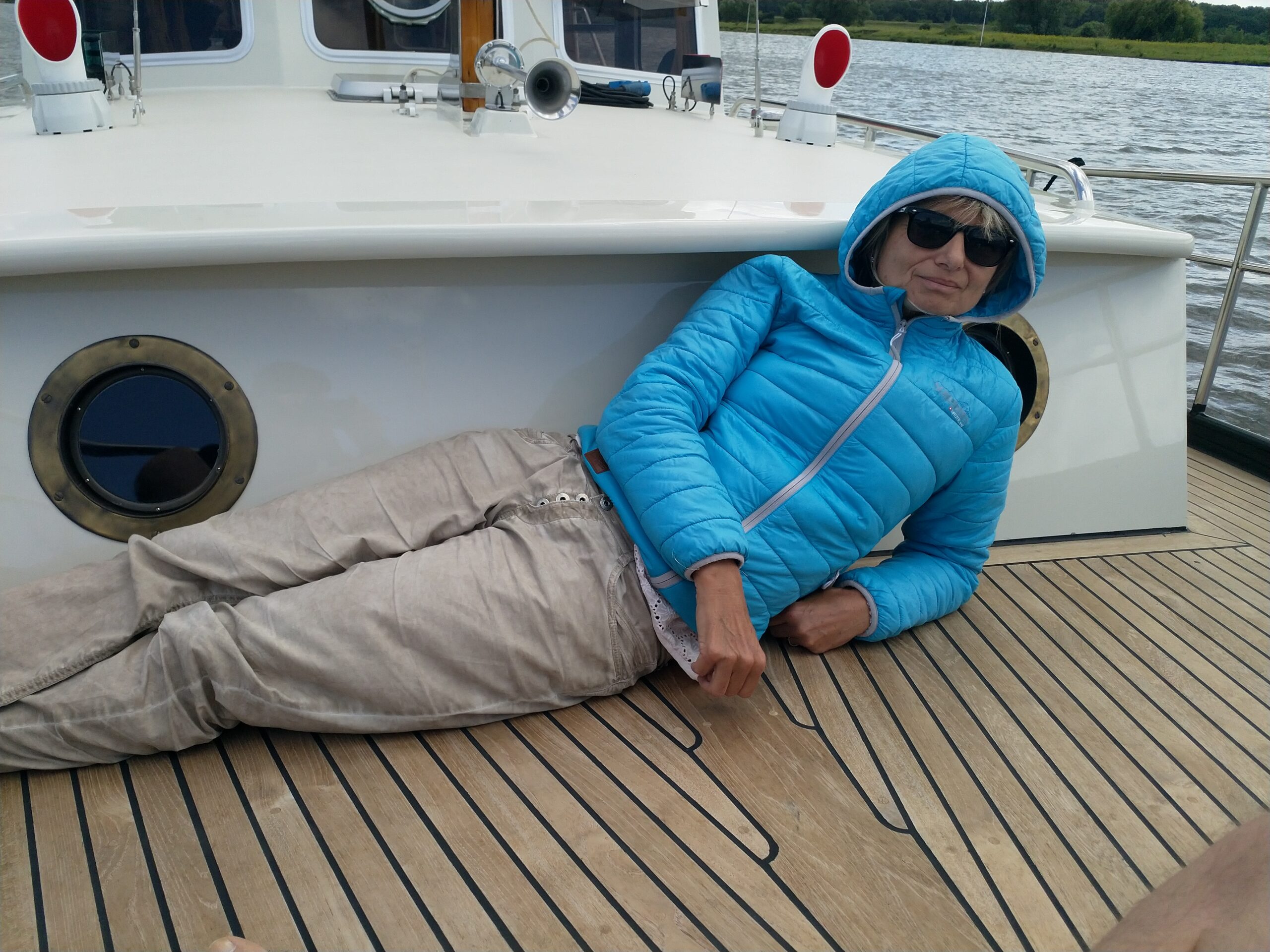 Auf der Rückfahrt war das Wetter etwas kühl, der Himmel bedeckt. Wie man die Reise auf dem warmen Deck trotzdem geniessen kann, zeigt Brigitte.