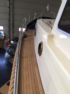 Links ist die bequem breite Gangway mit dem abgeschliffenen Teakholz auf dem neu gefugten Oberdeck zu erkennen. Die Bullaugen sind fachmännisch abgedichtet. Das Oberdeck ist frisch gestrichen.