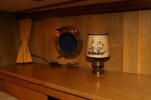 Das zeigt sich beispielsweise auch in der hinteren Kajüte. Die Messing-Bullaugen passen zum Schiff und die Lampe gehört zur DNA wie die gelben Vorhänge, die die Schuller-Werft neu ausgestattet hat.