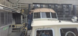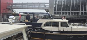Da der Schwimmpoller mit einer Latenz reagierte, hing die Taranaki plötzlich am Tau. Es war so eingeklemmt, dass ich erstmals mein Matrosenmesser einsetzen musste. Aber für solche Fälle hat man es ja. Mit dem Schleuserhaken an der Leiter konnte ich das Schiff halten und Brigitte hatte Zeit, ein neues Tau um den Poller zu legen. Die Lehre aus diesem Vorfall: Bis der Schwimmpoller auf das Absinken des Wassers reagiert, wird ausschliesslich gefiert. Erst wenn das der Fall ist, wird frühestens angebunden.