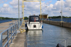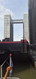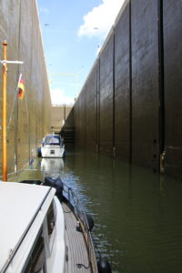 Dann fuhren wir in die Schleusenkammer ein. Brigitte freute sich, hatte es doch Schwimmpoller, an dem wir die Taranaki festmachten. Das Schleusentor schloss sich und wir schleusten talwärts.