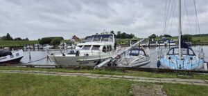 Wir verliessen den tollen Wittinger Sportboothafen um 8:00 Uhr. Nachdem ich gestern bis an die Kade vorgeholt hatte, musste ich dem Steg entlang zurückfahren, wenden und wieder in den Elbe-Seitenkanal einbiegen.