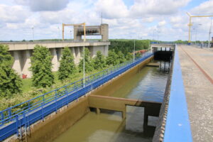 Neben der Schleuse sind Auffangbecken installiert, damit nicht der ganze Inhalt der Schleusenkammer ins Unterwasser der Schleuse verloren geht.