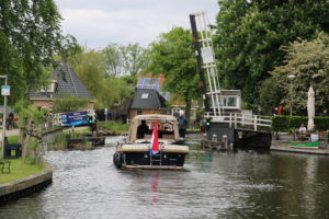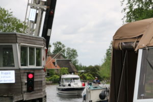 Anschliessend gelangten wir ins Giethoornsche Meer, das wir durchquerten. Die Wasserstrassen sind gut markiert und deshalb gefahrlos zu durchfahren. Kurz nach Muggenbeet kommt eine Brücke mit 5.40 m Durchfahrtshöhe. Das heisst für uns Masten ablegen. Während der Fahrt muss Brigitte solche Aktionen durchführen.